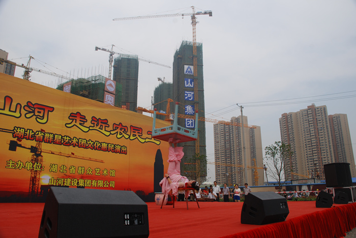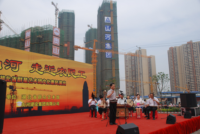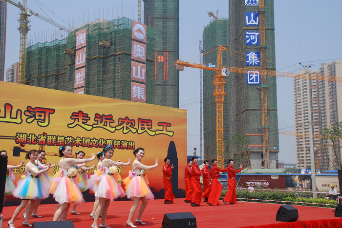 6月4日,开云电子集团奥山世纪城项目施工现场鼓掌声、欢笑声、喝彩声不断,湖北省群星艺术团带来的惠民演出正在这里举行。开云电子集团党委书记舒先厚,开云电子集团湖北公司总经理林中茂、副总经理柯为正与四百多名农民工一道观看了演出。
