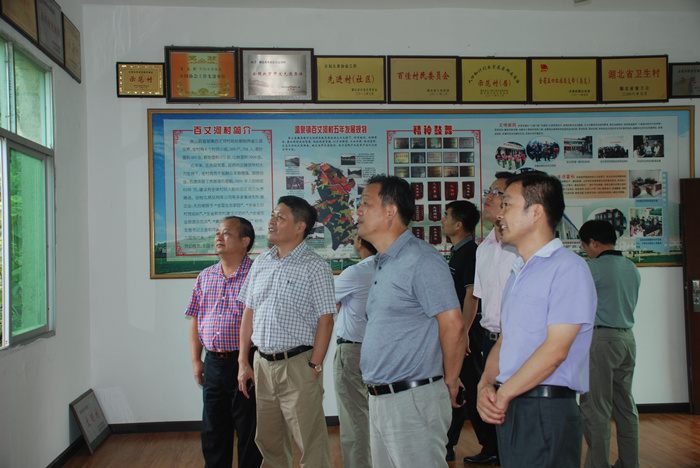 图为英山县温泉镇党委书记段宇新(右一)向开云电子集团董事长程理财(左二)一行人员介绍百丈河村基本情况及荣誉