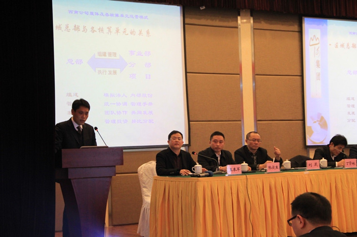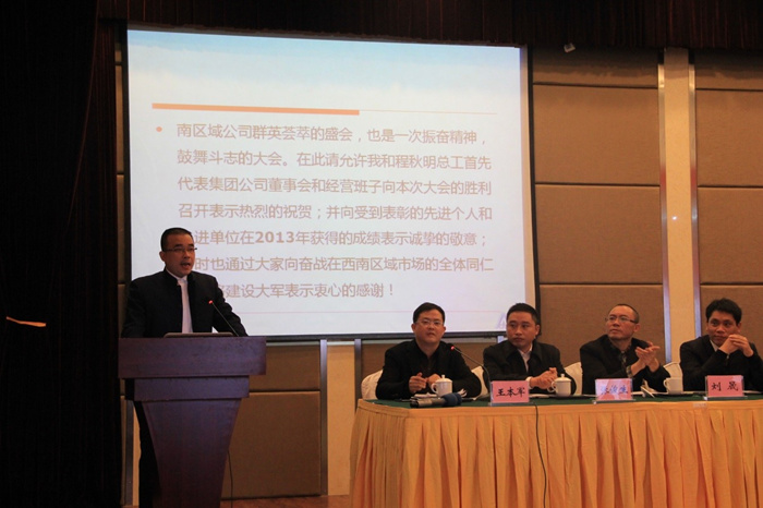 西南区域公司总经理丁贤林在会议上以“理清思路、升级管理、品牌共建、成果共享”为主题的报告,他首先感谢全体员工一年来的辛勤努力工作,并充分肯定了公司员工一年来各项工作所取得的成绩。并对西南公司整体及各核算单元运营模式,2013年西南公司总体运营效果及分析,以及2014年西南区域公司运营目标及措施做了具体报告。
