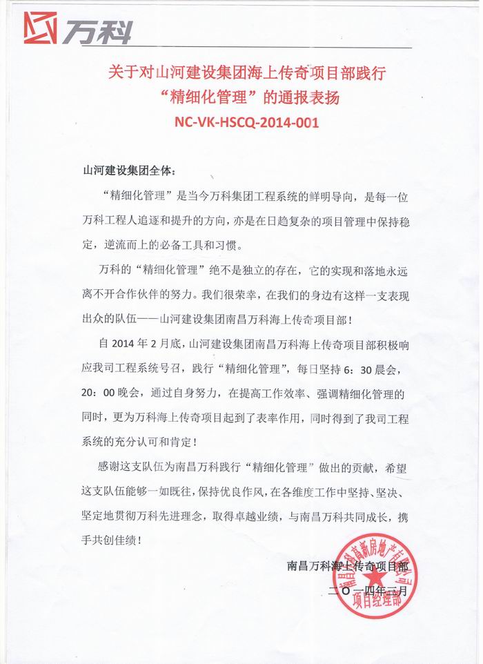 践行精细化管理 集团海上传奇项目部获万科通报表扬