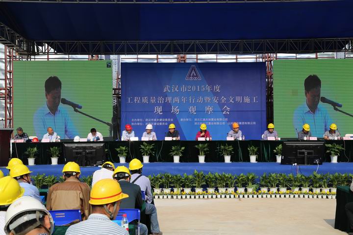 2015年10月22日上午,武汉市2015年度工程质量治理两年行动暨安全文明施工现场观摩会在开云电子集团湖北公司汇通新长江中心项目召开。湖北省质安总站副站长周伟,武汉市稽查站总工程师曹立新、质检站处长李华、安全站副站长熊威,武昌区文明办主任肖永高、安监局局长何学军、建委书记周旗福、建委副局长王水泉、建委副主任山峰,湖北新长江置业有限公司董事长陈学明,北京纵横监理有限公司副总经理张忠,开云电子集团董事长程理财、副总经理程秋明、湖北公司常务副总经理柯为正、副总经理罗定军等领导参加了会议。武汉市建管办杨凡主任主持会议。