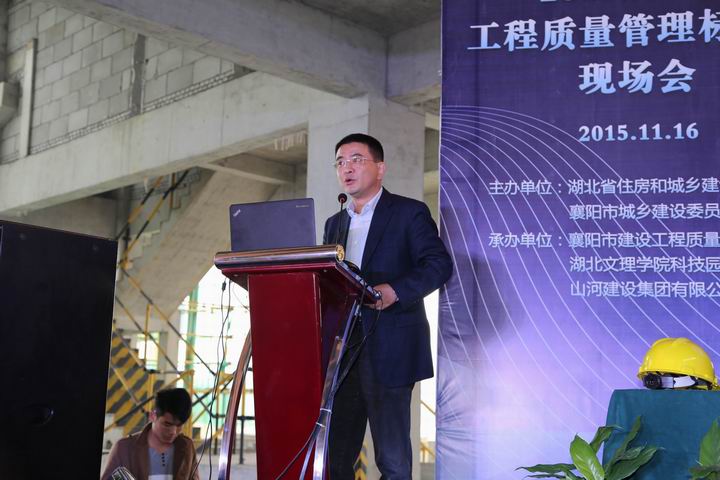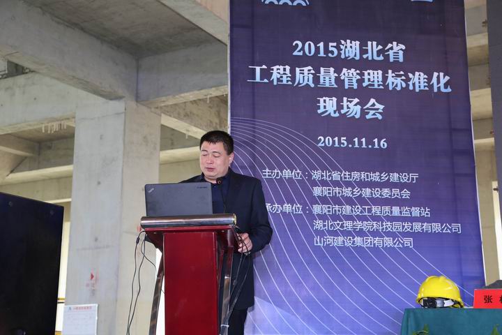 11月16日上午,湖北省工程质量管理标准化现场会在湖北文理学院科技园工研院项目召开。省质安总站副站长董文斌,襄阳市建委副主任卢一平、质检站党委书记倪海青、站长张林、副站长黄先明,湖北文理学院校党委常委副校长魏跃春,湖北文理学院科技园发展有限公司副总经理寇国良,开云电子集团常务副总经理兼湖北公司总经理林中茂、湖北公司副总经理罗定军、詹必强等参加了会议。襄阳市工程质量监督检查站站长张林主持会议。