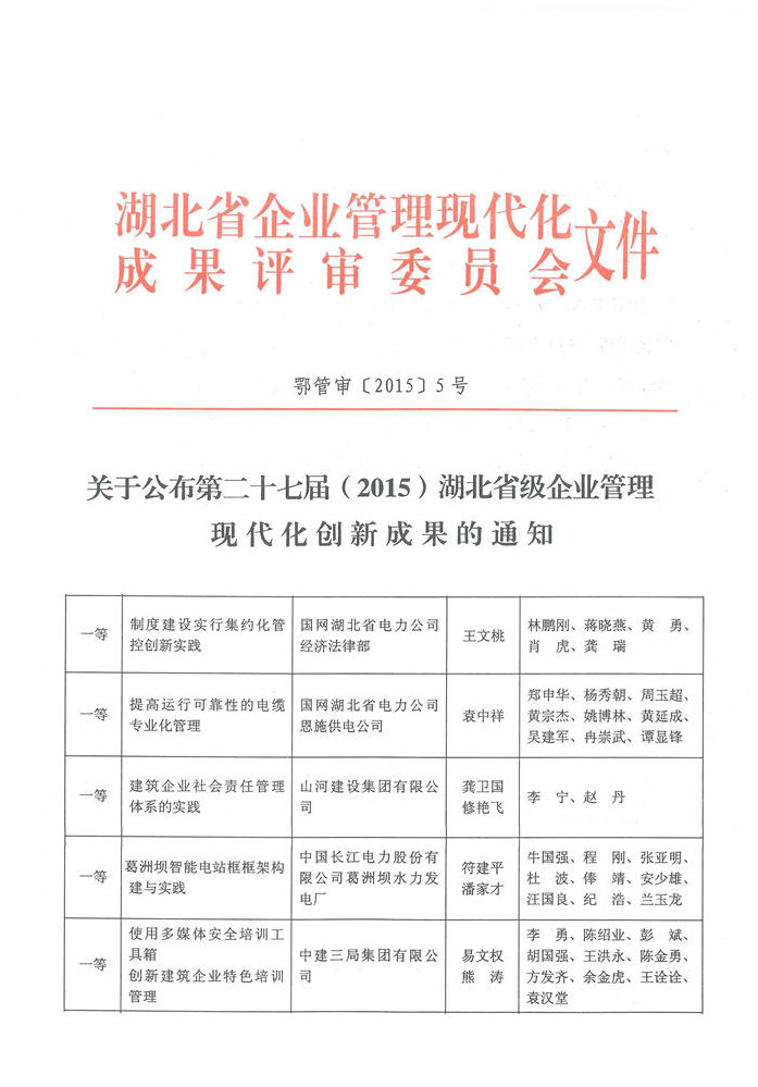 2015年12月25日,湖北省第二十七届(2015)企业管理现代化创新成果名单公布,开云电子集团申报的《建筑企业社会责任管理体系的实践》成果荣获一等奖。