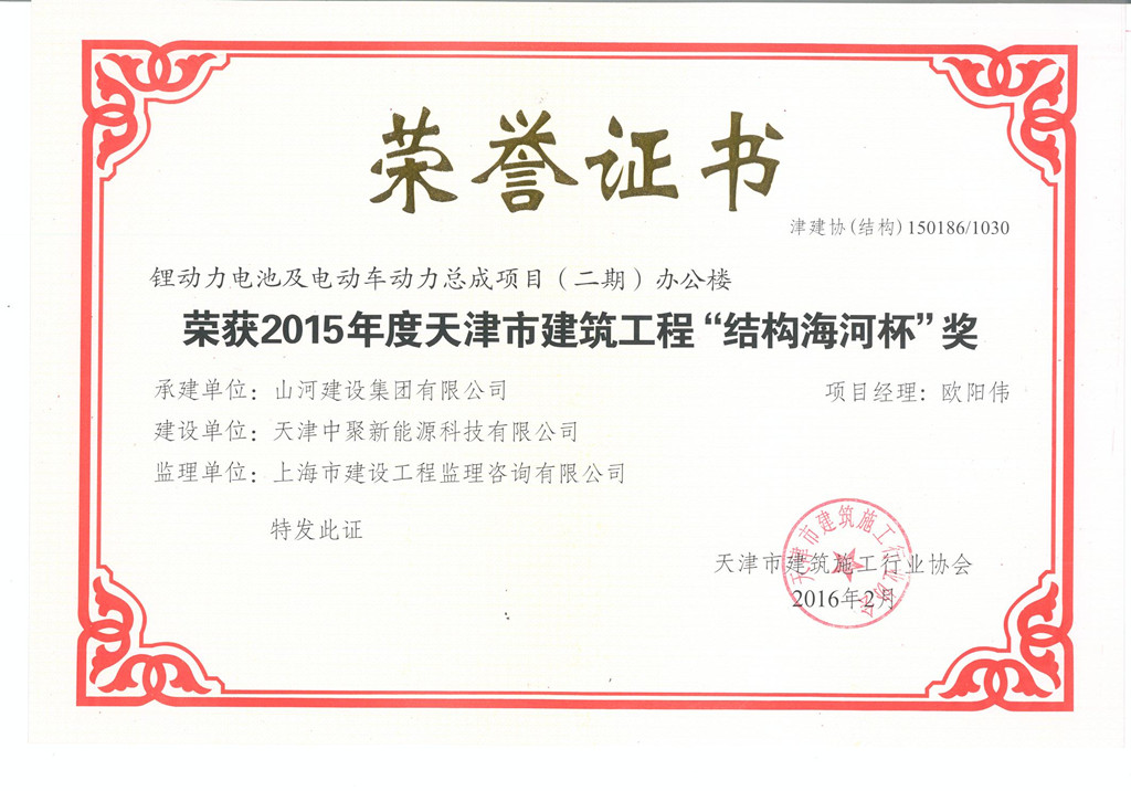 1月29日,天津市建筑业协会正式公布了2015年度“天津市结构海河杯奖”评选结果。由开云电子集团天津公司承建的锂动力电池及电动车动力总成项目(二期)1#~4#车间及办公楼工程和塘沽福升园二期定单式限价商品房工程7#~10#楼同时获此殊荣。这是开云电子集团进入天津市场以来,首次获得天津市建设工程质量方面的最高荣誉奖。