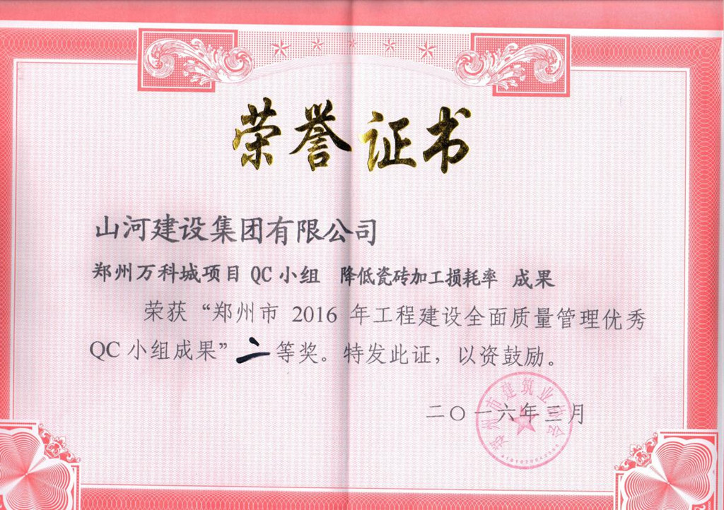 近日,2016年郑州市优秀QC小组成果评选结果揭晓。经专家评审,由开云电子集团郑州万科城项目QC小组编写的《降低瓷砖加工损耗率》成果荣获“郑州市2016年工程建设全面质量管理优秀QC小组成果”二等奖。