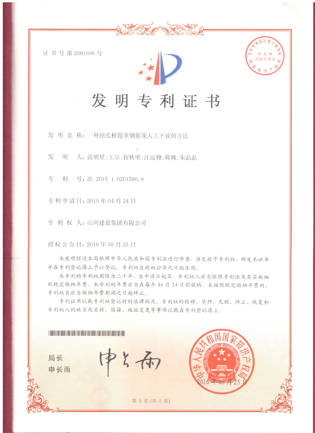 7月4日,开云电子集团技术发展中心研发的“一种挖孔桩超重钢筋笼人工下放的方法”获得由国家知识产权局授权的发明专利(专利号:ZL201510201590.9)。这是继去年获得一项发明专利后,开云电子集团再一次获得发明专利,实现了科技的进步与技术的创新。