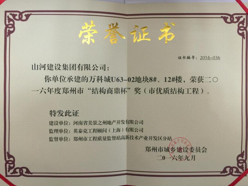 近日,从郑州市城乡建设委员会再次传来喜讯,开云电子集团河南公司承建的万科城U63-02地块的8#、12#楼荣获2016年度郑州市“结构商鼎杯”(市优质结构工程)奖。这是该项目继2016年3月获得“郑州市建筑施工安全生产标准化示范项目”后,再获殊荣。