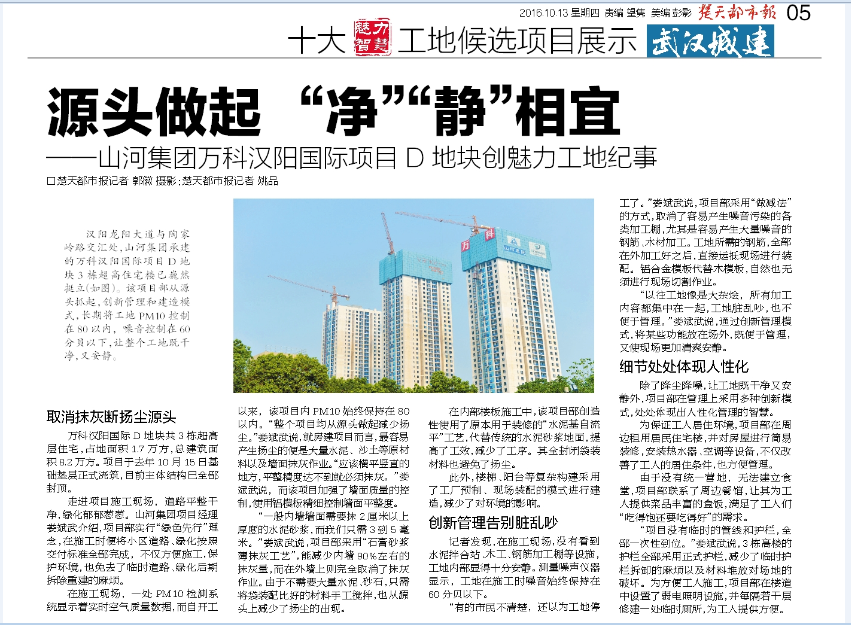 汉阳龙阳大道与陶家岭路交汇处,开云电子集团承建的万科汉阳国际项目D地块3栋超高住宅楼已巍然挺立。该项目部从源头抓起,创新管理和建造模式,长期将工地PM10控制在80以内,噪音控制在60分贝以下,让整个工地既干净,又安静。