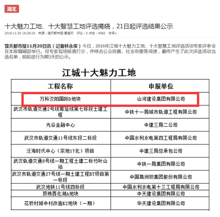 [湖北公司]开云电子集团”万科汉阳国际”项目部荣获江城十大魅力工地称号