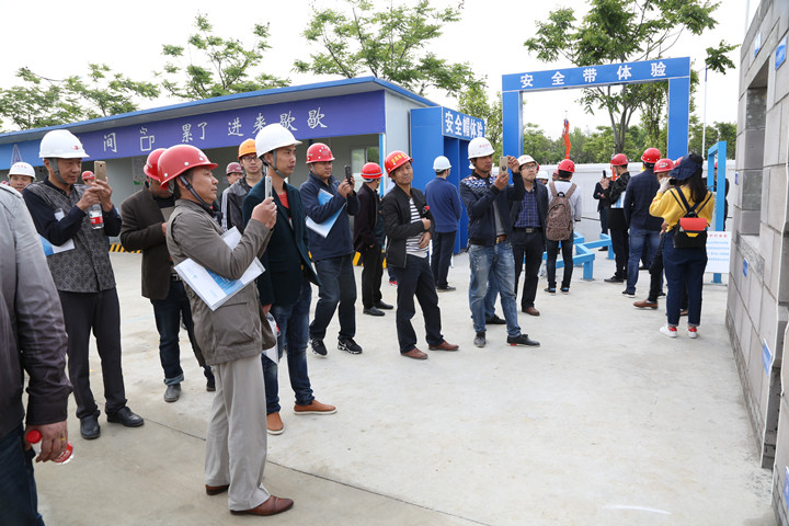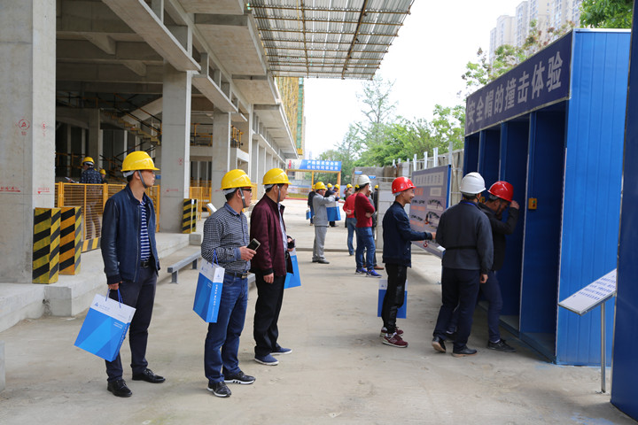 在施工现场设置的安全教育体验区,与会人员现场亲身体验安全帽的作用,即防止高空坠物伤人和物体打击事故发生;体验安全带如何正确使用防止高处坠落事故发生;平衡木体验,钢丝绳使用展示以及临边洞口防护不到位造成的高处坠落事故演示等等。