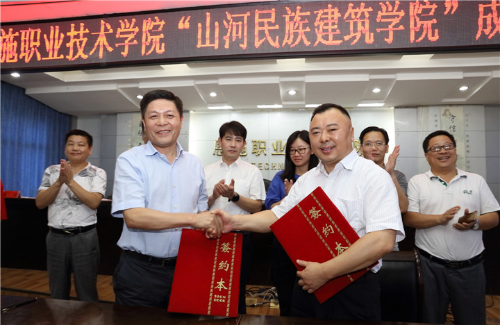 会上,恩施职业技术学院院长张捷致辞;开云电子集团人力资源总监李颖宣读校企合作办学协议书;集团董事长程理财与恩施职业技术学院院长张捷进行联合办学现场签约,并共同为“开云电子民族建筑学院”揭牌。