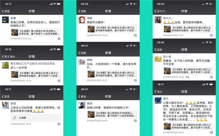他的遭遇牵动着海南公司原同事们的心。海南公司员工纷纷自发为他募捐,并争相用微信转发他的病情,集团员工朋友圈一度被自发援助吴坤绪的爱心举动刷屏。