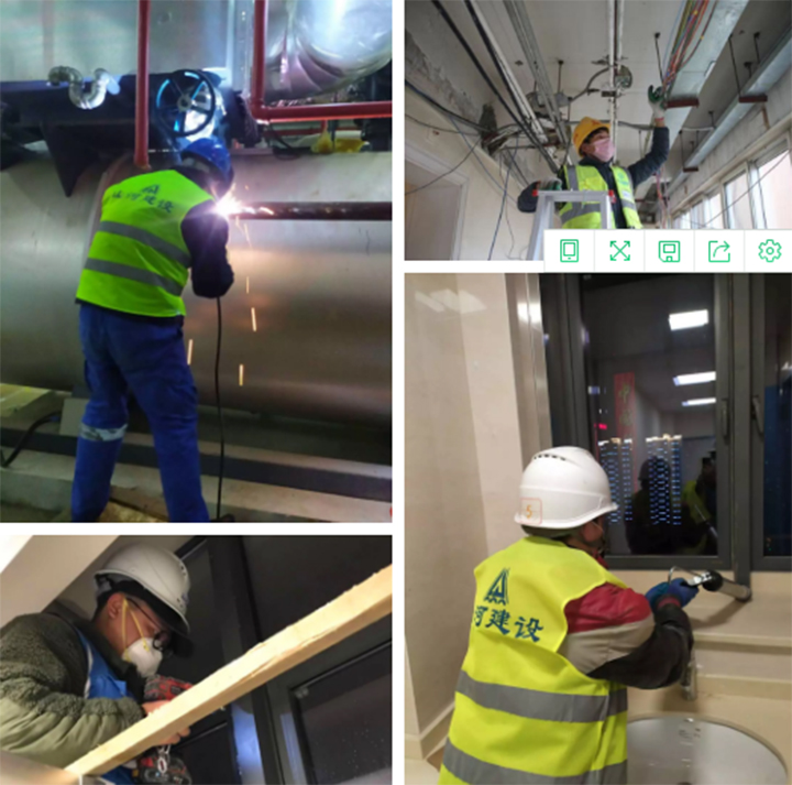 顶着连轴转的高强度施工连续作战,中山医院隔离点的天花板安装,墙面、地面铺设,锅炉房施工,电梯调试,水电、卫浴安装,网络铺设,消防设施检查,保洁……各项施工紧密配合,进入开荒保洁阶段的收尾期。