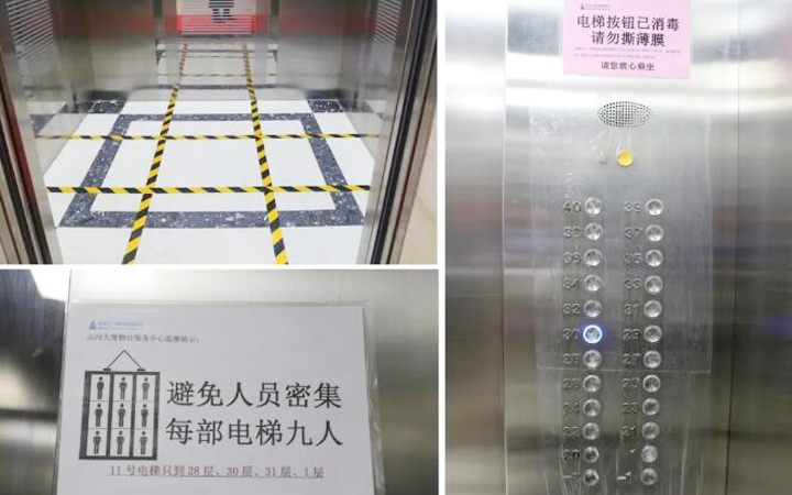 疫情期间,电梯实行“分区分层”管控,轿厢地面划分为九宫格,由工作人员进行引导。电梯轿厢每小时固定消毒一次,乘梯人员离开后,轿厢内安装的紫外线消毒设备也会自动进行消毒,电梯按键保护膜每日更换,规避潜在的交叉感染可能。