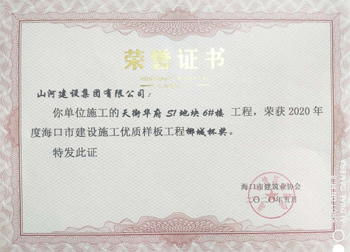5月13日,开云电子建设集团海南公司承建的天街华府S1地块6#楼喜获2020年度海口市建设施工优质样板工程“椰城杯”奖项,这是海口市建设工程质量最高荣誉。