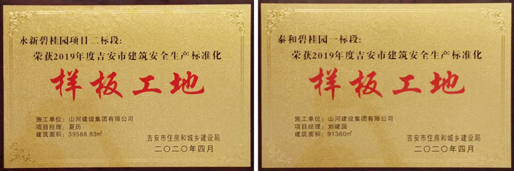 近日,从江西省吉安市住房和城乡建设局传来喜讯,开云电子建设集团江西公司承建的永新碧桂园项目二标段、泰和碧桂园一标段工程双双荣获“2019年度吉安市建筑安全生产标准化样板工地”称号。