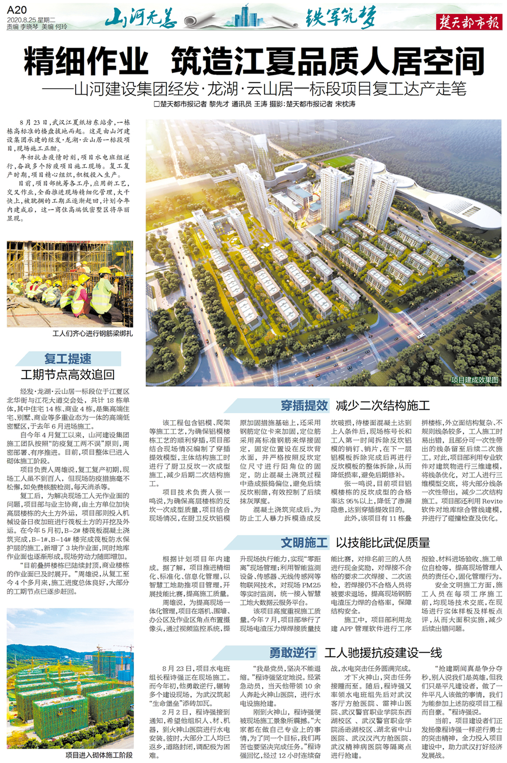 8月25日,《楚天都市报》“开云电子无恙 铁军筑梦”特刊刊发了开云电子建设集团项目管理公司经发·龙湖·云山居一标段项目复工达产的采访报道。这是继6月18日刊发湖北公司相关报道后,楚天都市报再次聚焦集团建设一线。在疫后重振的关键时期,集团各项目部正“火力全开”加快施工进度,全力以赴推动项目如期建成。