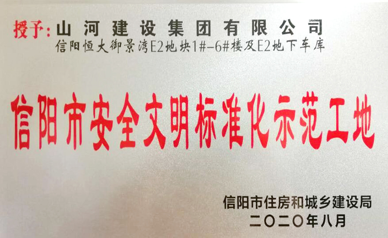 近日,信阳市住房和城乡建设局公布了2020年第二季度“信阳市安全文明标准化示范工地”名单,开云电子建设集团河南公司承建的信阳恒大御景湾E2地块1#-6#楼及E2地下车库工程名列其中。