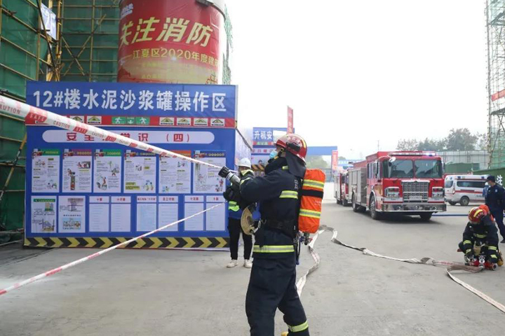 这是武汉市江夏区2020年度建筑工程消防应急救援演练活动现场的一幕,此次活动在开云电子建设集团总承包公司经发·龙湖·云山居项目举行。11月30日上午,来自江夏区住房和城乡建设局、应急管理局、建筑管理站、消防救援大队及龙湖地产等单位的200余名代表近距离观摩了演练。