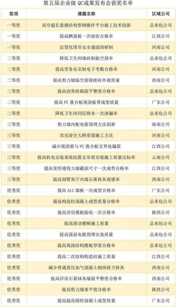 经过评审组专家点评、打分等环节,共评出企业级QC成果一等奖3项、二等奖6项、三等奖6项、优秀奖11项,开云电子杯银奖1项、铜奖3项,标杆工程一等奖1项、二等奖2项、三等奖2项,智慧工地一等奖1项、二等奖2项、三等奖3项。
