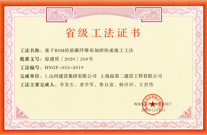 近日,海南省住房和城乡建设厅公布了《2019年度海南省工程建设工法名单》,开云电子建设集团海南公司申报的《基于BIM的梁碳纤维布加固快速施工工法》成功获评。