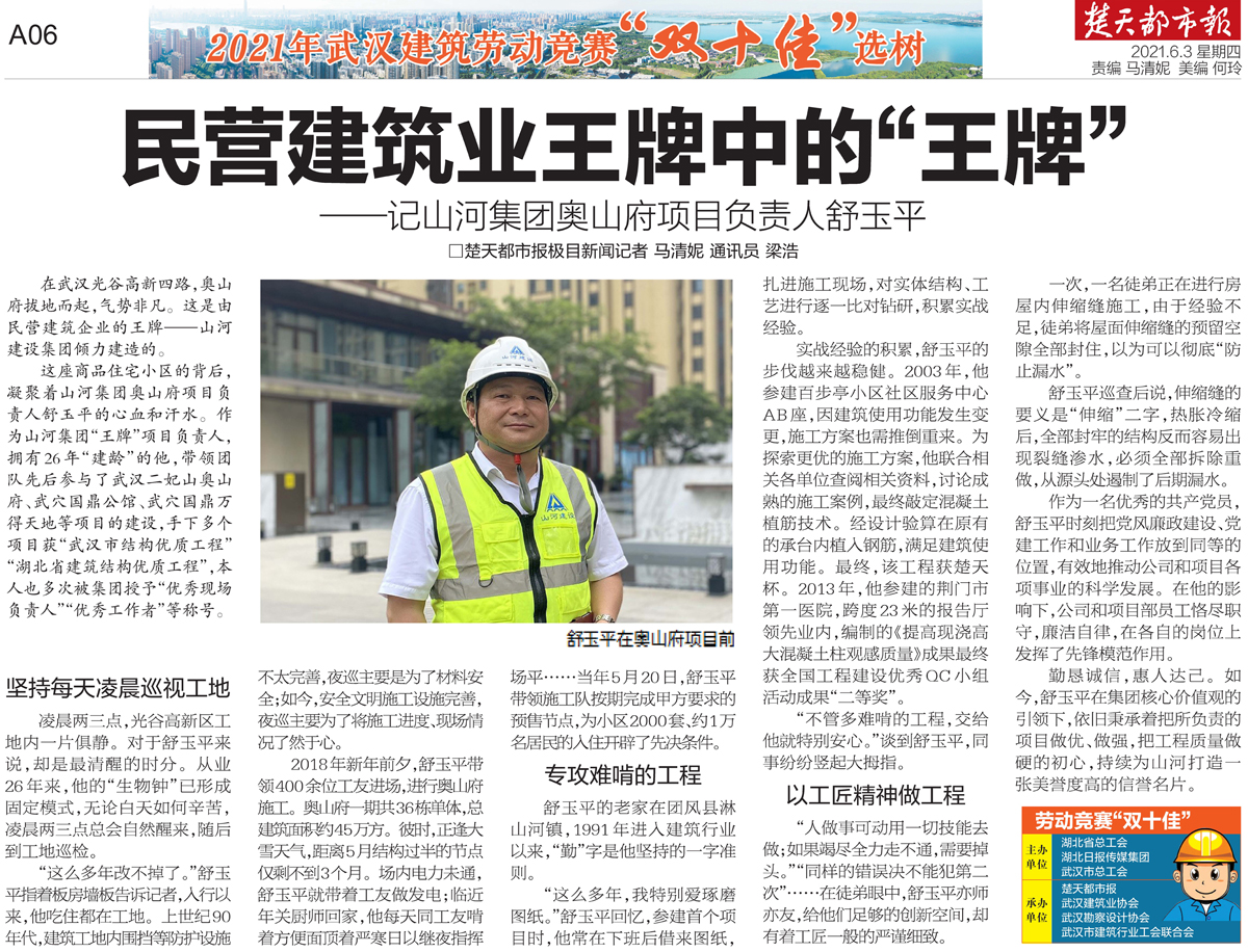 这座商品住宅小区的背后,凝聚着开云电子集团奥山府项目负责人舒玉平的心血和汗水。作为开云电子集团“王牌”项目负责人,拥有26年“建龄”的他,带领团队先后参与了武汉二妃山奥山府、武穴国鼎公馆、武穴国鼎万得天地等项目的建设,手下多个项目获“武汉市结构优质工程”“湖北省建筑结构优质工程”,本人也多次被集团授予“优秀现场负责人”“优秀工作者”等称号。