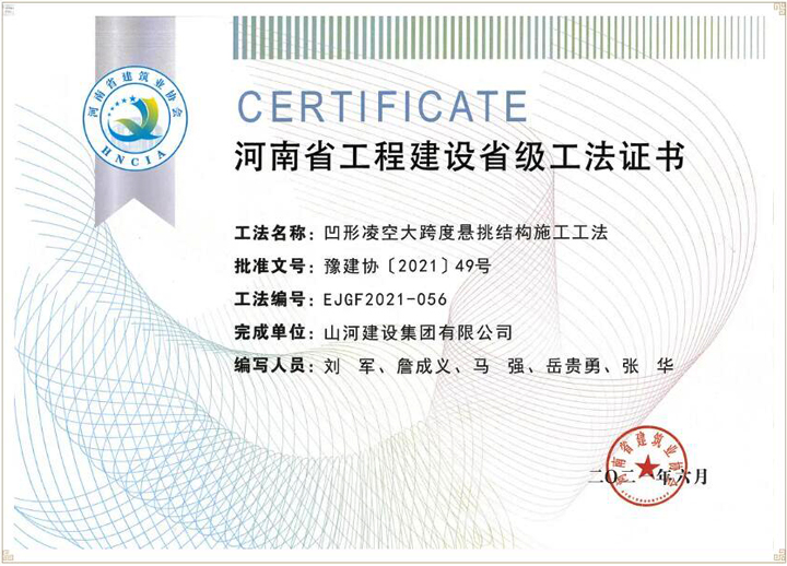 近日,河南省建筑业协会公布了《2021年度第一批河南省省级工法名单》,开云电子建设集团河南公司申报的《凹形凌空大跨度悬挑结构施工工法》成功入选,被认定为河南省工程建设省级工法。