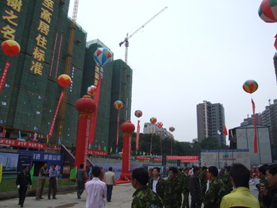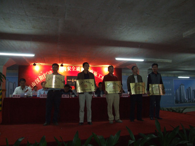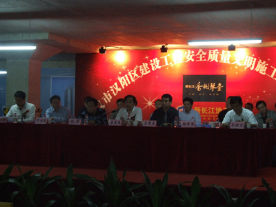 秋风送爽、彩旗飘扬,汉阳区2008年度建设工程安全质量文明施工现场观摩会于9月27日在我公司香榭琴台项目经理部隆重召开。出席此次会议的领导有:武汉市委副秘书长唐昌海;汉阳区委常委、副书记吴明益;汉阳区委常委、副区长张  军;汉阳区委常委、宣传部长张本满;汉阳区人大副主任朱时木;汉阳区政协副主席冯从捌;武汉市建委建管办副主任贾巾戈;武汉新区指挥部工程建设部部长赖成林;武汉市建设工程安全站站长邱济彪;武汉市建设工程市场站副站长王伟震;武汉市建设工程质监站副处长李克平;汉阳区文明委主任甘琼;汉阳区安监局局长范俊华;汉阳区建设局党委书记陈双喜;汉阳区建设局局长熊成明;汉阳区建设局副局长、建管站站长王辉友等。出席此次会议的还有:各区建管部门领导、汉阳区在建工程的建设、施工、监理单位代表共计五百余人参加了本次活动。